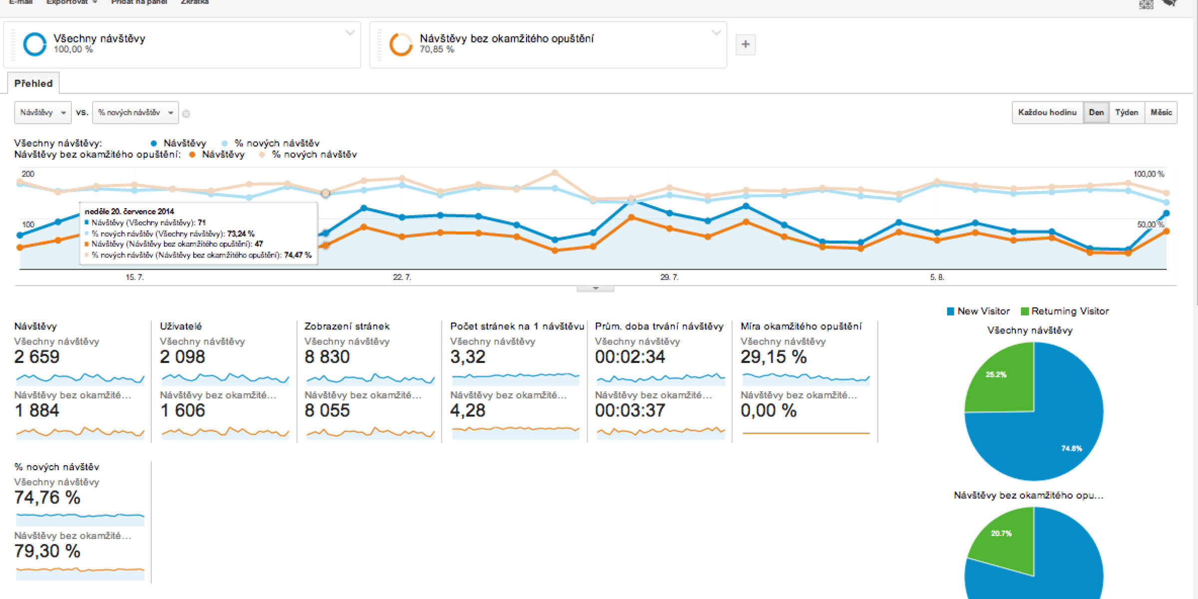 Níže pod grafem (Screen 4) jsou znázorněny souhrnné ukazatele v číslech – za celé zvolené období spolu s koláčovými grafy pro každý vybraný segment s poměrem nových versus vracejících se uživatelů. Ještě níže pak najdete demografické údaje, z nichž se můžete proklikat k návštěvnosti z jednotlivých zemí, měst, jazykových skupin, prohlížečů, operačních systémů (Windows, Android, iOS apod.) , poskytovatelů služeb (Vodafone, UPC apod.) a dokonce i rozlišení obrazovky zařízení, na kterých si uživatelé prohlíželi vaše stránky.