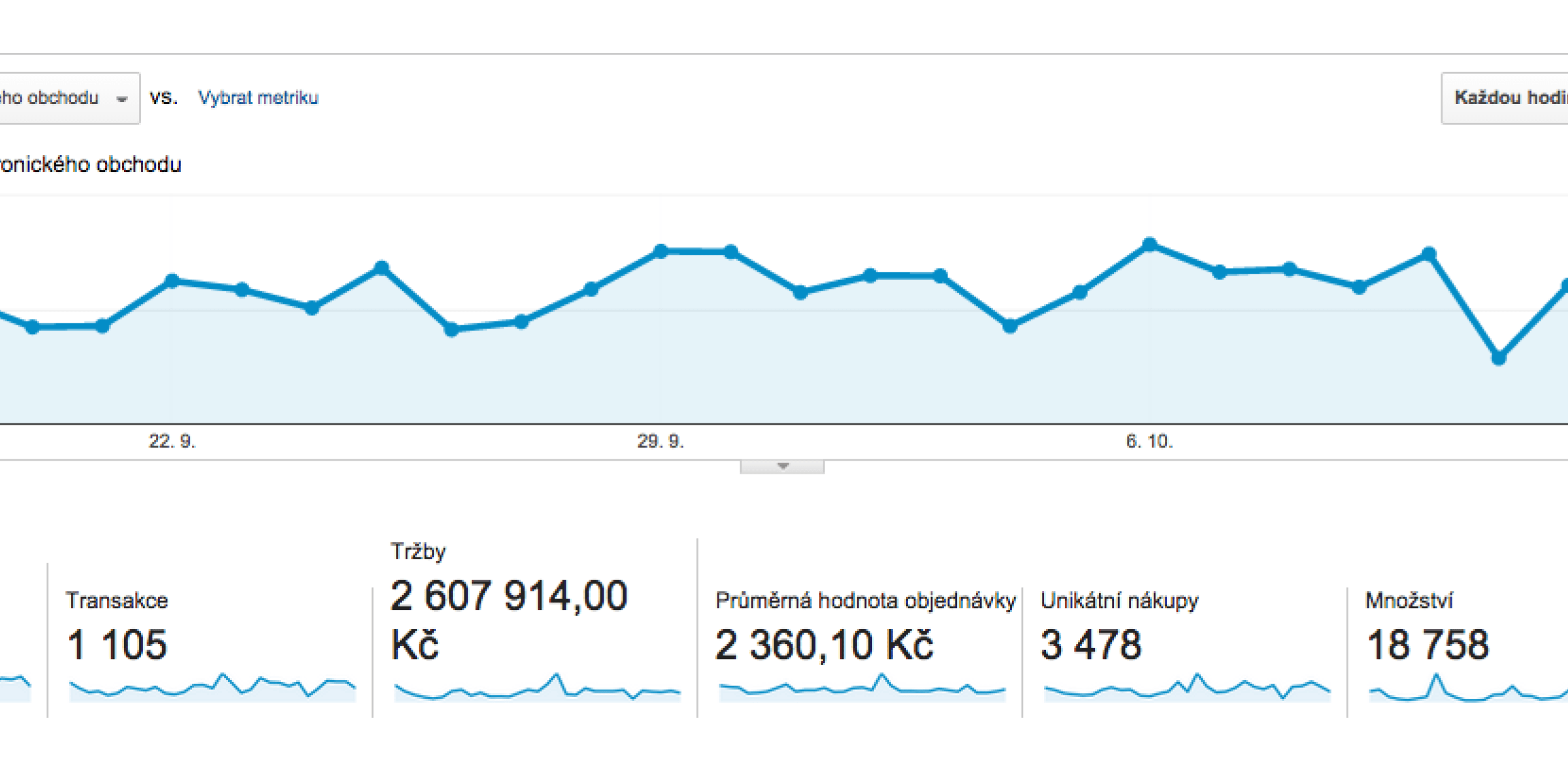 Z pěti hlavních metrik Přehledu elektronického obchodu (screen 2) mají největší vypovídací hodnotu Konverzní poměr elektronického obchodu a Průměrná hodnota objednávky. Konverzní poměr značí procento návštěv, které byly završeny transakcí. Souvisí s efektivitou designu vašeho webu a také účinností vámi prováděného marketingu. Přivádí váš marketing na web ty správné návštěvníky, kteří mají v úmyslu nakoupit, a usnadňuje jim design vašeho webu nakupování? Podle Průměrné hodnoty objednávky zase můžete posoudit úspěšnost uzavírání obchodů na svém webu – motivuje web návštěvníky například k nákupu souvisejících produktů nebo motivují vaše slevy k nákupu většího množství daných produktů?