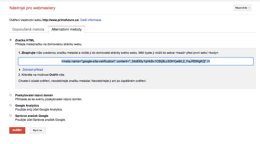 4. Dle instrukcí zkopírujte vygenerovanou část zdrojového kódu (značku metadat), kterou budete vkládat do zdrojového kódu svého webu do sekce <head></head>. Tato úprava se provádí na vašem FTP serveru. Neopouštějte ale ještě zcela váš účet ve Webmaster Tools, nechte jej zatím otevřený, jelikož po vložení vygenerované meta značky na web se sem budete muset vrátit, abyste vaši webovou stránku ověřili.