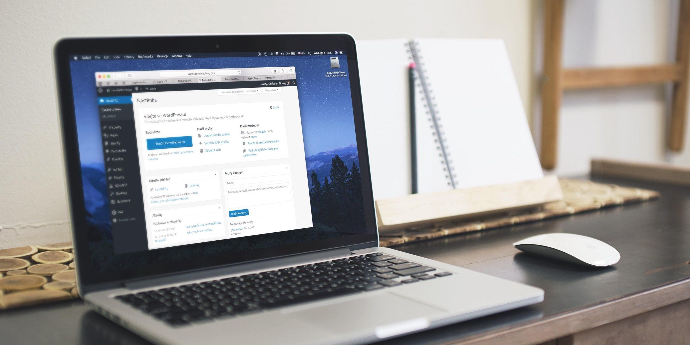Nejvýše v levém menu najdete odkaz Nástěnka. Kliknutím se dostanete na stránku, kde se zobrazují informace o webu. Najdete zde počet příspěvků a stránek nebo odkaz na poslední publikované příspěvky. Můžete vytvořit rychlý příspěvek pomocí pole Rychlý koncept nebo se dozvíte aktuální novinky ze světa Wordpressu.