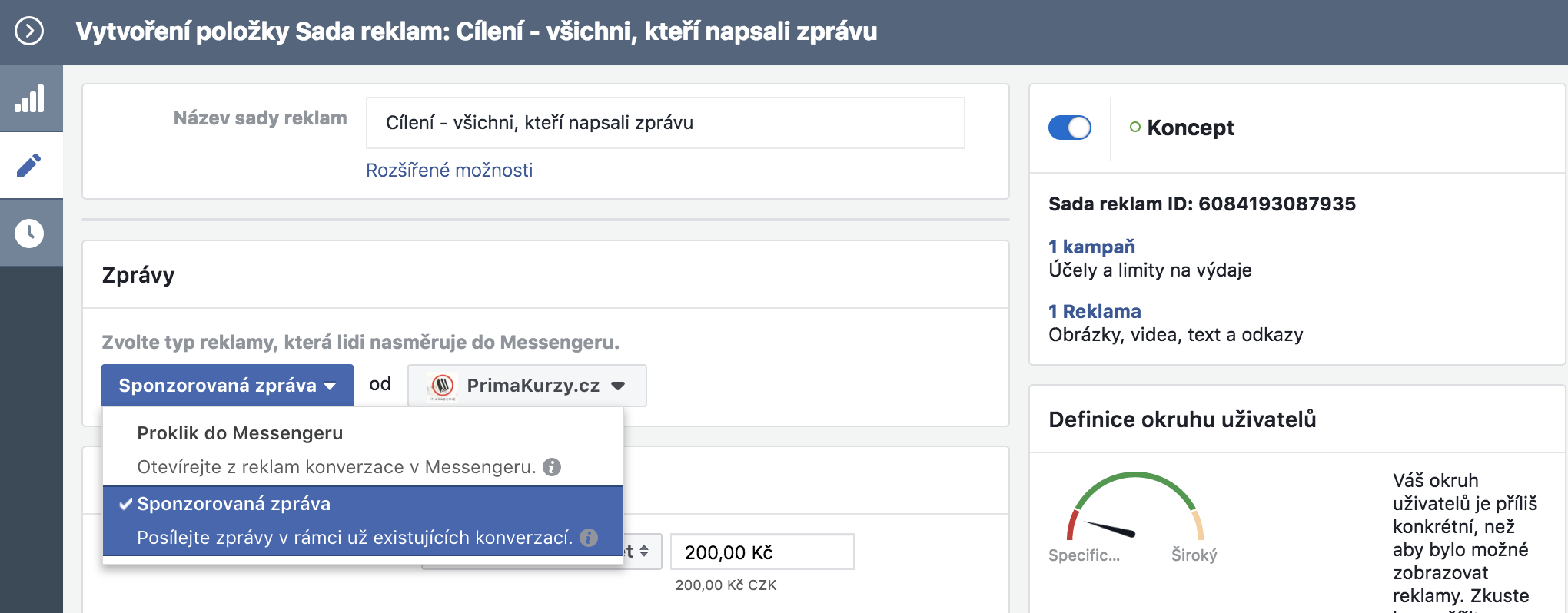 Dále přejděte do Sada reklam --> Zprávy --> zde vyberte sponzorovaná zpráva a konkrétní firemní profil